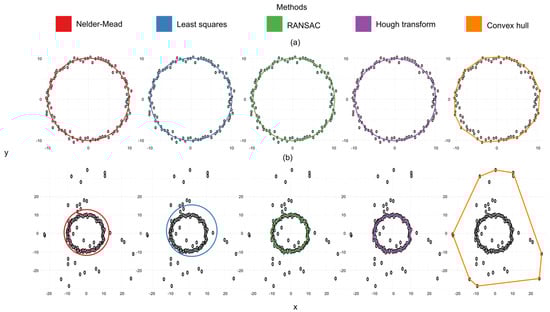 On the other hand, with uniform outliers (Table 3), the Nelder–Mead, least squares, and convex hull methods obtain centers far from the correct position, a radius larger than the expected value and large bias and variance values. However, the most robust methods have good results since they fit more accurately (low bias and low variance).