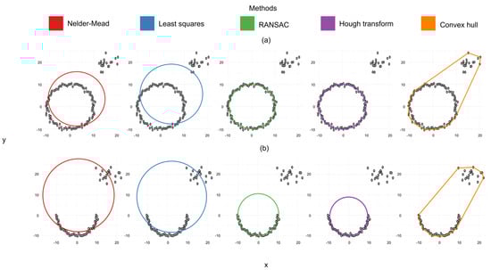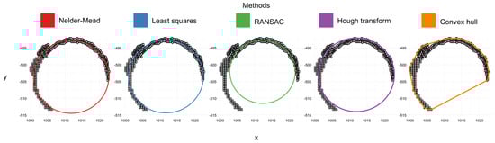 In cases of clustered outliers, the results are presented in Table 4. The RANSAC method and Hough transform performed well up to the half-circle; the other methods showed an increasing level of error, with overestimates in radius and position and with a bias toward clustered values. At the quarter-circle, the MSE error of RANSAC is 54.29 (51.51 + 2.78), while the Hough transform produces a value of 0.21 (0.16 + 0.05). The variability of the convex hull in the different cases and its lack of robustness indicate that it is not a reliable method. The results for the quarter-circle match the expected values by coincidence. This alignment is not a direct consequence of the algorithm’s design, but rather a geometric coincidence specific to this scenario. The methods used are not specifically optimized for quarter-circle shapes, and the coincidence arises from the particular arrangement and sampling of points in this case.