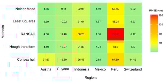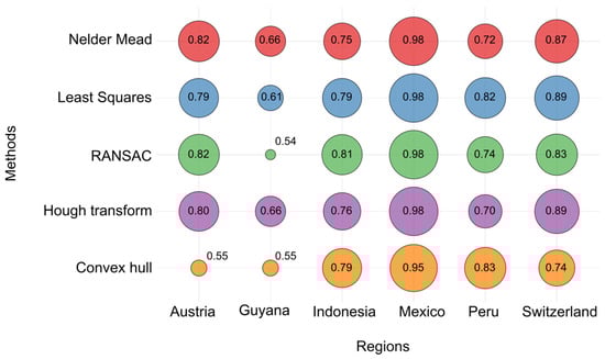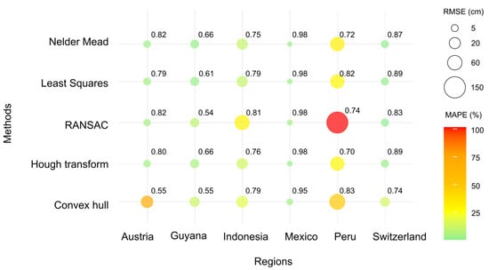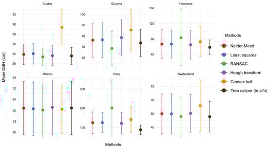 In this analysis (Figure 5), the estimation methods are compared with in situ measurements (tree caliper) across various regions. Nelder–Mead and least squares show more consistent performance in most regions, with narrower error bars indicating lower variability and higher accuracy in environments with more regular geometries. However, in regions such as Peru and Guyana, where forest structures are more complex, a wider dispersion in results is observed, suggesting an impact of environmental characteristics on the estimates.