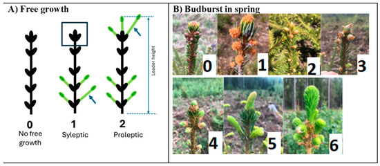 Figure 1. (A) Types of free growth of the leader shoot in fall of three years, 2020, 2021, 2022, in the Norway spruce plantations established in 2016: 0—no free growth. 1—sylleptic type of free growth, where no visible bud scale burst is observed on the apical surrounding terminal buds at the top of the leader shoot (the boxed top). In fall, all buds counted on the leader, including the terminals (11 buds in the figure with type 1), along with the buds that broke the scales and elongated for at least a few millimeters (4 such buds in the figure with type 1); length of the longest lateral shoot that formed after the second flush was measured (in type 1, marked by an arrow, the lower right); 2—proleptic type of free growth where budburst of the terminal buds on the leader shoot was observed. The buds were counted in the same way as for sylleptic growth (11 buds in total of these 7 with budbust). Length of the longest elongating terminal shot was measured (marked by arrow, upper right in type 2). (B) Spring budburst scores from 0 to 6.