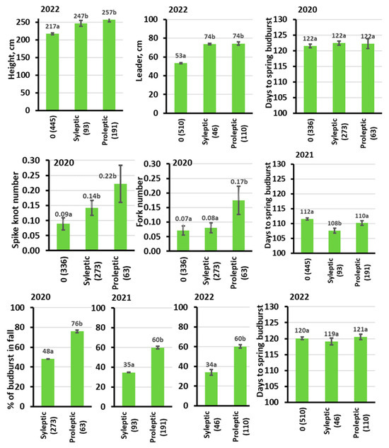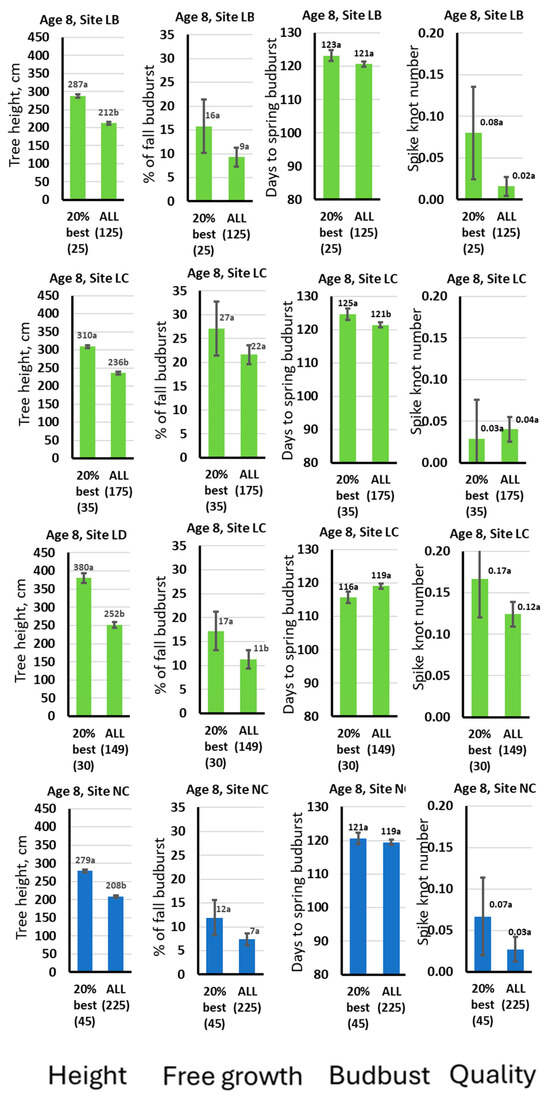 Figure 2. The main characteristics of 20% superior by height trees at age 8 (that was the oldest age of the assessments) compared with the overall mean and standard error for the same year 2022 (age 8). Budburst is the budburst in spring (growth onset). Columns of the bar plots are abbreviated at the bottom of the figure to indicate what features the corresponding variable represents. Numbers in the brackets below the X-axis labels show the sample sizes. At the bar top, the mean trait values are shown along with the results for Tukey LSD test from the ANOVA, where the same letter at the top of each bar indicates no significant difference at the 0.05 significance level. The error bars are the standard errors. “% of fall bud burst” is the % of the burst buds on the leader shoot in fall (the main indicator of free growth intensity).