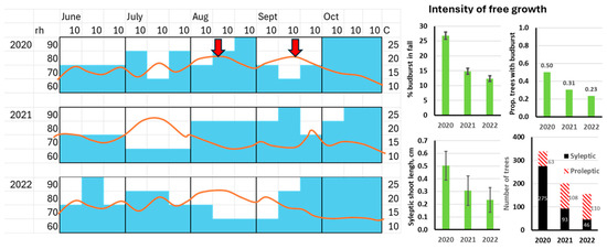 Figure 3. Effect of autumn air temperature (T) and air humidity (rh) on intensity of free growth during the three seasons in 2020, 2021, 2022 (age 6 to 9 years). Simplified diagram of mean daily values of T and rh is given (see actual climatic data in Figure S4). The blue shadings show rh by decade to be accounted for in the rh scores to the left (60%–90%). The red line drawn over the humidity bars shows temperature to be accounted for by the scale on the right side of the box. The three bar plots show free growth intensity: % of budburst of all buds on the leader in fall (upper left), proportion of trees with more than one budburst on the leader in fall (upper right), and length of the longest lateral (sylleptic) shoot on the leader (lower left). Number of trees by type of free growth (lower right). Moist and warm August together with warm September, such as in 2020, is likely to promote free growth (shown by arrows).