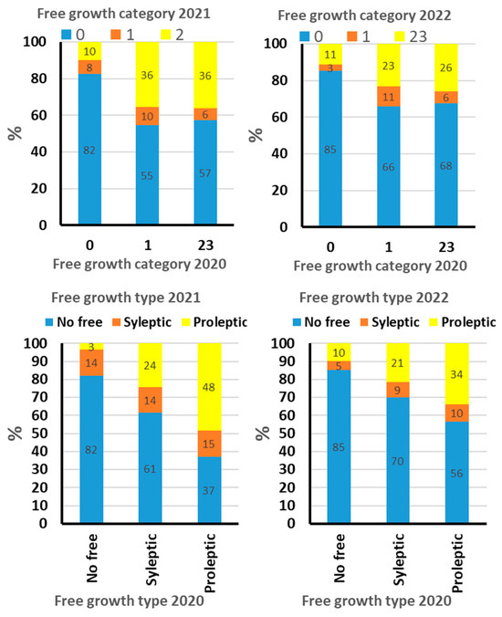 As regards the ability to retain the type of free growth over the seasons, (a) only 38% to 30% of the 272 trees with sylleptic growth in 2020 retained the sylleptic type of free growth over the two subsequent seasons by mainly losing free growth (only 14 to 9% switching to proleptic), and 61 to 70% of the sylleptic trees lost free grow in 2021 and 2022, (b) while the trees with proleptic free growth in 2020 (61 of such trees out of 660) better retained the proleptic type of free growth—48 and 34% of the proleptic trees remain as such in 2021 and 2020; only 37 and 56% of the proleptic trees lost their free growth the two subsequent seasons (Figure 4).