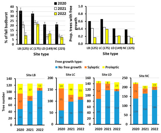 Figure 5. Site effect on intensity free growth (based on % autumn budburst on the leader (upper left); the error bars are standard errors and tree frequency with autumn budburst on the leader (upper right)). The lower line of bar plots shows the effects of site type on shifting between the free growth types over the three years (data values at the bars are the tree numbers). Over the years, the proleptic type increased mainly in moist fertile sites (LC).