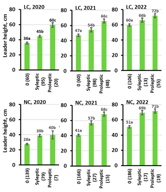 Figure 7. Leader height for the trees with no free growth (0): sylleptic and proleptic types are given by site type and year. LC—temporarily overmoistured rich, NC—normally irrigated rich. The letters at the data labels show the Tukey LSD test results, where the same letter indicates no significant difference at 0.05 p level. The error bars are standard errors.