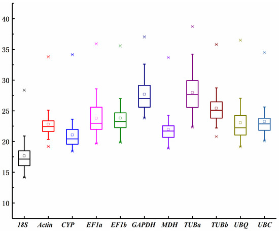 Distribution of qRT-PCR Ct values of candidate reference genes across all samples (includes the control and treatment samples). X-axis represents reference genes. Y-axis represents the Ct value. The final Ct value of each sample was the mean of three biological and technical replicates. Box graph represents the interquartile range. The line across the box is the median value. The two bars represent the minimum and maximum values, respectively; the small square in the box shows the mean values. ӿ represents the non-outlier and outlier.