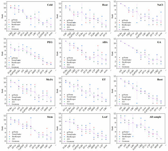 Aggregation of four rankings. Each plot contains five types of ranking including (geNorm, NormFinder, BestKeeper, ΔCt and Geomean). The geometric ranking of candidate genes was calculated comprehensively by four types of rankings (geNorm, NormFinder, BestKeeper and ΔCt) under different treatments.