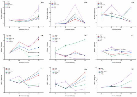 Through comprehensive analysis of the rankings generated by the four aforementioned algorithms, a recommended comprehensive ranking was established under abiotic stress, hormonal treatments, and a variety of plant tissues, as shown in Table 2, Figure 2, and Supplementary Tables S7 and S8. Among all samples—including conditions of cold stress, NaCl stress, PEG stress, ABA treatment, MeJA treatment, and both stem and leaf tissues—ACT was identified as the most stable gene. EF1b was recognized as the most stable gene for heat stress and GA treatment, while CYP exhibited the most stability for root tissue and UBC for ethrel treatment (Figure 2; Table 2). Conversely, TUBa was identified as the least stable reference gene in MeJA treatment, ABA treatment, NaCl stress, and across stem and leaf tissues. Additionally, 18S was the least stable gene in GA treatment and root tissues.