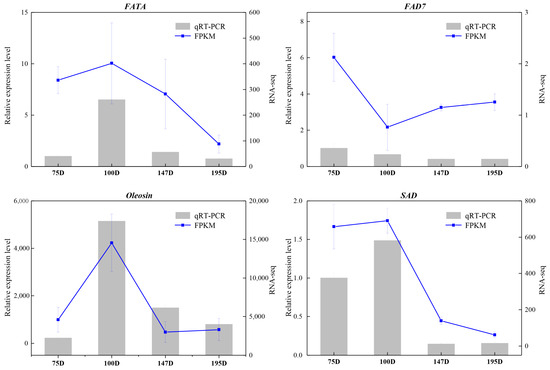 Validation of qRT-PCR results through comparison with RNA-seq expression profiles. X-axis represents the days after the anthesis of macadamia kernel samples. Y-axis represents the gene relative expression level by qRT-PCR. The histograms show the qRT-PCR results involved fatty acid biosynthesis in kernel of Macadamia after anthesis; the line charts show the FPKM values of these fatty acid biosynthesis genes in kernel of Macadamia. qRT-PCR results represent the mean (±SD) of three biological replicates. 75D (75 days after anthesis), 100D (100 days after anthesis), 147D (147 days after anthesis), and 195D (195 day after anthesis).