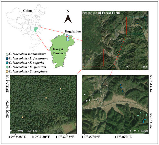 The experiment was conducted at the Fengshushan Forest Farm (29°17′ N, 117°22′ E) in Jiangxi Province, central China. The region has a humid mid-subtropical monsoon climate. The average annual temperature, and the mean temperatures in January and July, are 17.1, 4.6, and 28.7 °C, respectively. The average length of the growing season is 274 days and the mean annual precipitation is 1805 mm. The soil type comprises red soil formed by the weathering of slate and mound rock. The shrubs in the understory of the stands included Loropetalum chinense (R. Br.) Oliv., Maesa japonica (Thunb.) Moritzi, etc.; the understory herbaceous vegetation mainly consisted of Woodwardia japonica (L. F.) Sm., Dicranopteris pedate (Houtt.) Nakaike, etc.