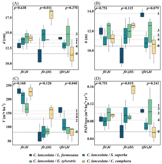 Comparisons of diameter at breast height (d, A), tree height (h, B), stand volume (V, C), and PAIVtree (D) among different mixtures of Chinese fir and broad-leaved tree species. The dotted lines 0 to 4 indicate the average values for monocultures of C. lanceolata (Lamb.) Hook., L. formosana Hance, S. superba Gardner & Champ., E. sylvestris (Lour.) Poir., and C. camphora (L.) Presl, respectively. The p-value refers to the significance of differences among the stand types.