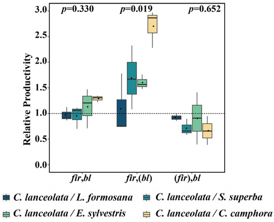 Compared with Chinese fir monocultures, C. lanceolata/L. formosana and C. lanceolata/S. superba mixtures showed slight underyielding at the stand level, whereas C. lanceolata/E. sylvestris and C. lanceolata/C. camphora mixtures showed overyielding with average RPfir,bl values of 1.13 and 1.29, respectively (Table 3). At the species level for Chinese fir, the RPfir,(bl) varied among the four types of mixtures (Table 3 and Figure 3). The observed productivity of Chinese fir in C. lanceolata/E. sylvestris and C. lanceolata/C. camphora mixtures substantially exceeded that of monocultures by 60% and 170%, respectively. At the broad-leaved tree species level, the four species all exhibited underyielding compared with the respective monocultures. In particular, the observed productivity of S. superba in mixtures was substantially lower than that of monoculture (p < 0.05).