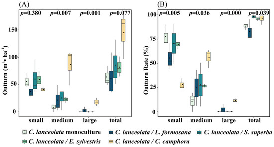 The (A) outturn and its (B) rate of dimension lumber of Chinese fir grown in monoculture and mixtures. Small, medium, and large represent types of dimension lumber. The p-value refers to the significance of differences among the stand types.