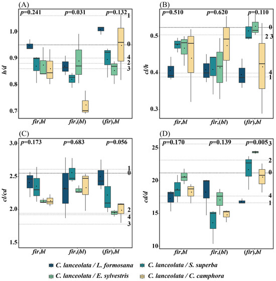 The comparison of (A) h/d, (B) cl/h, (C) cl/cd, and (D) cd/d among different stand types. The dotted lines 0 to 4 indicate the average values for monocultures of C. lanceolata, L. formosana, S. superba, E. sylvestris, and C. camphora, respectively. The p-value refers to the significance of differences among the stand types. The h/d, cl/h, cl/cd, and cd/d were the stem slenderness, the crown ratio, crown shape ratio, and crown projection ratio, respectively.
