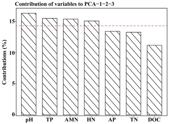 Total contribution of various indicators to the principal components 1, 2, and 3 (PCA 1-2-3). The red dashed line represents the expected mean contribution. Variables significantly contributed to primary components when their contribution exceeded this line.