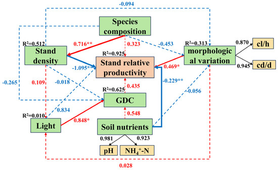 The final results of PLS-PM. Values adjacent to the lines denote the magnitude of the path coefficients calculated by PLS-PM. Solid red and blue arrows represent positive and negative relationships, respectively, while dashed arrows represent weak relationships. The width of the arrow is proportional to its significance level (* p < 0.05, ** p < 0.01). Numbers near arrows represent the standardized path coefficient. The R2 value represents the proportion of variance explained for each variable.