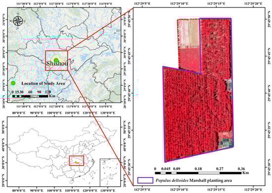 Figure 1 shows the geographic location of the study area for data collection. It is located within the National Superior Populus Seed Base in Shishou county, Hubei province, China. This county lies in the southern part of Hubei, along the middle reaches of the Yangtze River. The region is predominantly flat, with some low hills in the southwest. Shishou exhibits a subtropical monsoon climate with distinct seasonal variations. The average annual temperature ranges from 16 °C to 18 °C, with hot, rainy summers and mild winters. The county receives abundant rainfall, averaging between 1200 mm and 1400 mm annually, mostly concentrated during the summer. Rich in natural resources, especially water and wetland ecosystems, the area plays a crucial role in supporting agriculture and biodiversity. In Figure 1, the planting area of Populus deltoides is approximately 83,600 m2. It contains over 3000 Populus deltoides trees with different genotypes.