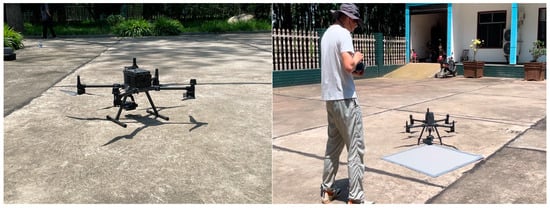 As shown in Figure 2, hyperspectral imagery was acquired using a 300TC hyperspectral camera (Beijing IRIS Remote Sensing Technology Limited, Inc., Beijing, China) loaded on a DJI M350 four-rotator UAV (Shenzhen Dajiang Innovation Technology Co., Ltd., Shenzhen, China). This camera has 308 spectral channels ranging from 393 to 1007 nm, with a spectral resolution of 2 nm. The UAV flight mission was conducted on May 14th between 10:00 and 15:00 under clear sky and low wind conditions. The spatial resolution of the hyperspectral imagery is 20 cm per pixel. Before the flight, radiation calibration was performed using a target cloth covered with Lambertian coating. The radiometric, geometric, and orthorectification processes were all conducted using the Mega Cube software (version 11.0.13), which developed independently by IRIS Corporation. After preprocessing, the hyperspectral reflectance data were acquired. Based on previous studies and the result of reflectance checks, bands above 891 nm were excluded due to spectral noise and distortions []. The remaining bands were then smoothed using the Savitzky–Golay filter []. To reduce the impact of localization errors on modeling, the average reflectance within a 3 × 3 pixels window centered on the leaf sampling point was used as the final reflectance in this study.
