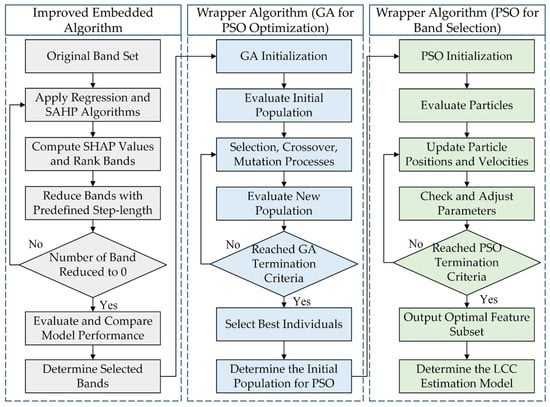 During the feature selection process, removing certain features alters the composition of the feature set. This change subsequently affects the importance of the remaining features. As a result, the feature ranking obtained from the original feature set may not be reliable for subsequent rounds of feature selection. To address these dynamic changes, the LCC estimation model is reconstructed after each band-removal step in this study, where the 10 lowest-ranked bands are removed. The newly updated feature ranking is then used for the next round of dimensionality reduction. The flowchart of this improved embedded algorithm is shown in the ensembled framework (Figure 4).