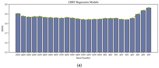 As shown in Figure 13, this study conducted the stepwise dimensionality reduction process based on the fixed GBRT ranking and different regression algorithm (second comparative performance). When using the GBRT regression algorithm, the RMSE increased as the number of bands decreased from 250 V to 170 V. As the number of bands further decreased from 170 V to 50 V, the RMSE stabilized within the range of 1.930 μg/cm2 to 1.960 μg/cm2. A significant increase in RMSE was observed when the number of bands dropped below 40 V. The lowest RMSE of 1.900 μg/cm2 was achieved at 190 V. For the SVR models, the RMSE increased as the number of bands decreased from 250 V to 70 V, followed by irregular fluctuations. In contrast, when using the GPR algorithm, the RMSE exhibited inconsistent fluctuations as the number of bands decreased from 250 V to 180 V. The best SVR and GPR models were achieved at 240 V (RMSE = 2.163 μg/cm2) and 70 V (RMSE = 1.981 μg/cm2), respectively. Compared to the results obtained using the SHAP ranking (Figure 5), the single feature selection process based on the fixed GBRT ranking not only resulted in larger errors in LCC estimation but also failed to maintain high estimation accuracy at lower dimensionalities. When developing the SVR and GPR models with the fixed GBRT ranking, the RMSE ranged from 1.900 μg/cm2 to 2.700 μg/cm2, which is significantly higher than the results achieved with the improved embedded algorithm, where the RMSE ranged from 1.800 μg/cm2 to 2.200 μg/cm2. These findings suggest that GBRT ranking is not well-suited for developing models when combined with other regression algorithms.