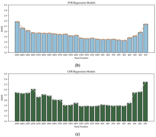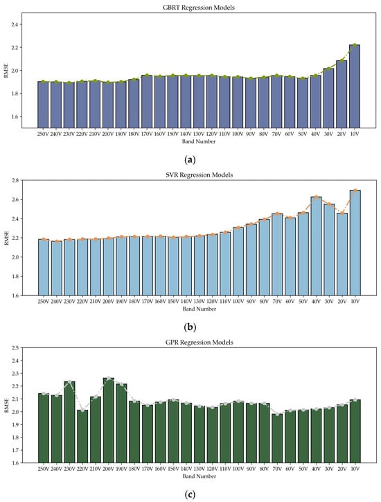 (a) RMSE value of the GBRT model during the stepwise dimensionality reduction process; (b) RMSE value of the SVR model during the stepwise dimensionality reduction process; (c) RMSE value of the GPR model during the stepwise dimensionality reduction process.