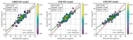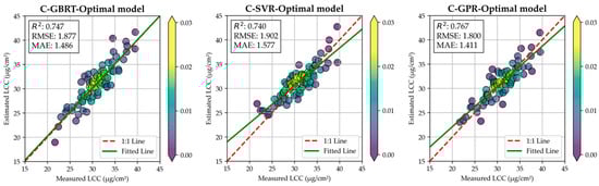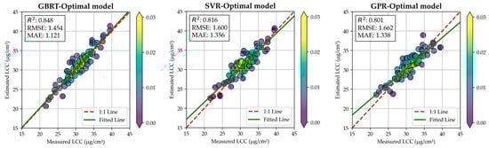 Figure 9 shows the boxplot of residuals for each optimal model across different LCC value ranges. Compared to the results shown in Figure 7, the distribution of residuals for each model has changed. For instance, the median of residuals for samples within the LCC range of 20 to 25 μg/cm2 is close to zero in the GBRT-Optimal model. This indicated that the overestimation has been mitigated. Moreover, within the LCC range of 35 to 40 μg/cm2, the median of residuals is negative for the GBRT-Optimal model, which indicates that the underestimation phenomenon has also been mitigated. For the SVR-Optimal model, the residuals have been significantly reduced in the range of 35 to 40 μg/cm2. In the GPR-Optimal model, the overestimation has been mitigated in the range of 20 to 25 μg/cm2.