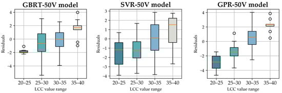 Residual distribution in different LCC range of the GBRT-50V model, SVR-50V model and GPR-50V model.