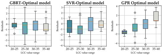Residual distribution in different LCC range of the GBRT-Optimal model, SVR-Optimal model, and GPR-Optimal model.