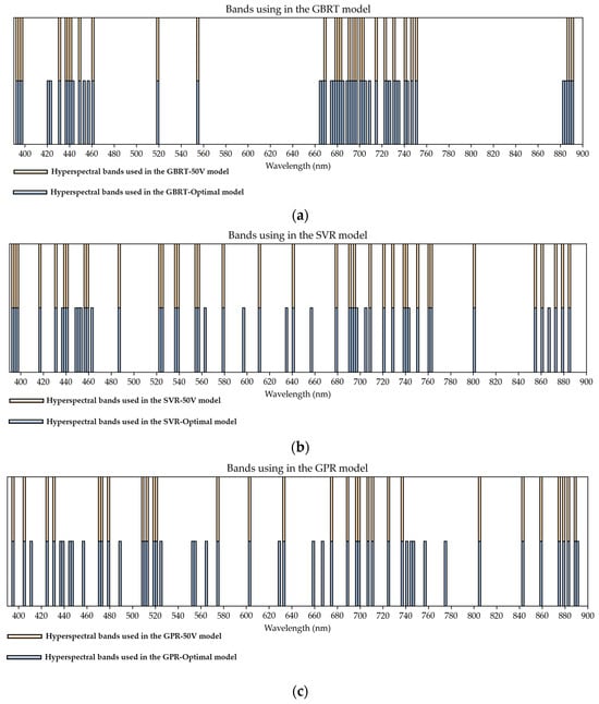 (a) Hyperspectral bands used in the GBRT-50V and GBRT-Optimal models; (b) Hyperspectral bands used in the SVR-50V and SVR-Optimal models; (c) Hyperspectral bands used in the GPR-50V and GPR-Optimal models.