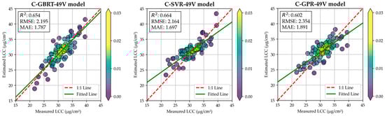 Figure 11 shows the selected 49 bands that achieved APCC values higher than 0.6. The bands are primarily concentrated within the ranges of 420 to 460 nm and 620 to 680 nm. These bands exhibit significant correlation with each other. As shown in Figure 12, the 49 bands were used as an input for developing the LCC estimation model. The C-SVR-49V model achieved the best performance, with R2 of 0.664, RMSE of 2.164 μg/cm2 and MAE of 1.697 μg/cm2. In contrast, the C-GPR-49V model achieved the lowest accuracy, with R2 of 0.602, RMSE of 2.354 μg/cm2 and MAE of 1.891 μg/cm2. Compared with the results of the proposed ensemble framework, the RMSE values of the C-GBRT-49V, C-SVR-49V, and C-GPR-49V models increased by 0.741 μg/cm2, 0.564 μg/cm2, and 0.692 μg/cm2, respectively.