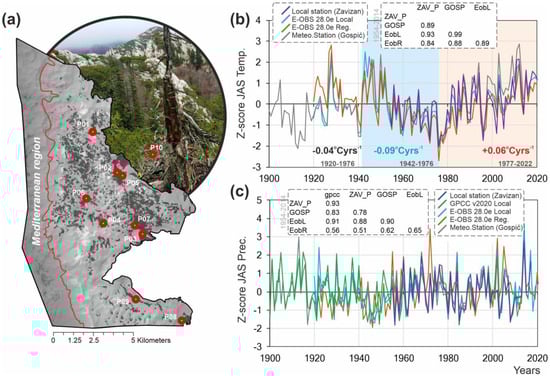 (a) The location of the experimental plots (P1–P10) in the Northern Velebit National Park. The black areas indicate pure mountain spruce forests. The red line marks the boundary between the Mediterranean and continental biogeographical regions. (b) Z-score of average air temperature values, (c) sum of precipitation in summer (July to September, JAS), for different climate data sources. Pearson correlation coefficients between time series of summer air temperatures (average from July to September, JJA) from local meteorological stations Zavižan and Gospić, and spatially explicit gridded data series, where meteorological stations are ZAV—Zavižan, GOSP—Gospić, EobL—local value of E-OBS v28.0e, and EobR—regional average for [15-20E, 40-45N] of E-OBS v28.0e.