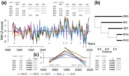 (a) Regional chronology (average of all studied site chronologies) according to standardization method (a), where RCS—regional curve standardization, RES—residual chronology, SDT—standard chronology, BAI_s—basal area increment combined with a 60-year spline and BAI—basal area increment. (b) Dendrogram of the cluster analysis between regional chronologies and (c) linear trends for the periods from 1950 to 1977 and from 1977 to 2013, together with the corresponding statistical indicators.