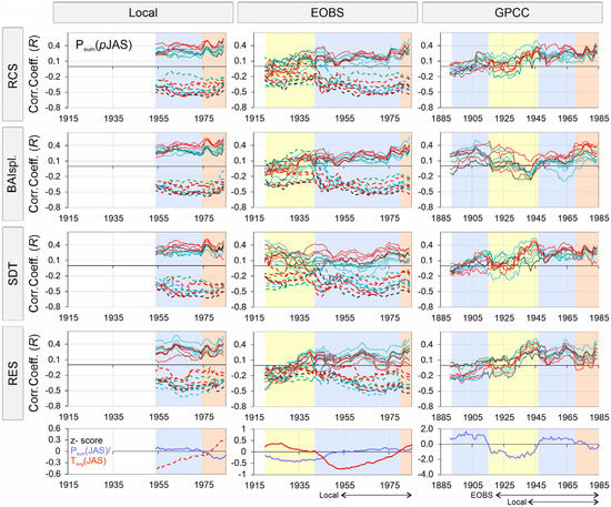 Moving correlations between chronologies and the dominant climate factor (total precipitation Psum (JAS) and average air temperature Tavg (JAS) in the summer of the previous year from July to September) using different sources of climate data. Correlations with precipitation (solid line) and air temperature (dashed line). Values of the standardized 35-year average of precipitation and air temperature for the same months.
