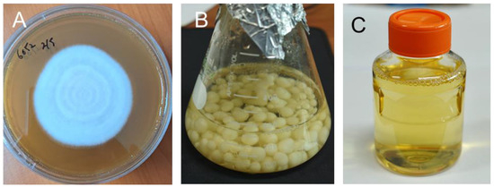 Preparation of fungal elicitor from P. chrysogenum. (A) Colony of P. chrysogenum grown on a PDA plate. (B) Mycelia cultured in liquid PDB medium under dark conditions at 100 rpm for 2 weeks. (C) Culture filtrate prepared for elicitation treatment.