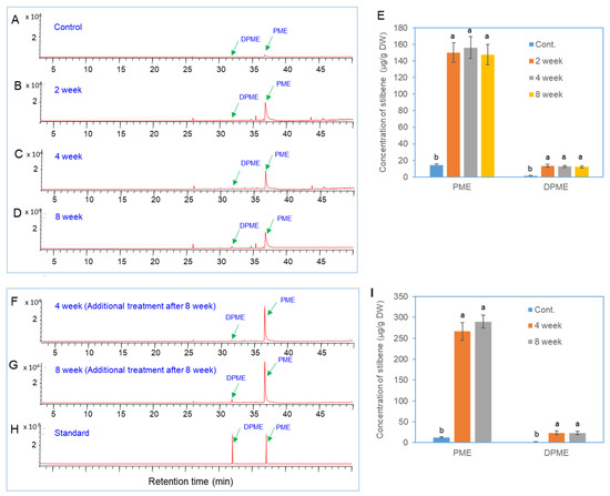 P. chrysogenum was cultured on solid PDA media for two weeks (Figure 1A) and then transferred to PDA liquid media for suspension culture, where it was grown for an additional two weeks (Figure 1B). A fungal elicitor (Figure 1C) was prepared by sterilizing and filtering the liquid medium after two weeks of fungal culture. The fungal elicitor was applied to B. xylophilus-susceptible Korean red pine (P. densiflora) plants through soil drenching. To investigate the metabolic changes in P. densiflora following fungal elicitor treatment, the accumulation of secondary metabolites in the needle extracts was analyzed via GC/MS. Selected ion monitoring (SIM) of the GC/MS results revealed a clear increase in pinosylvin stilbenoids, specifically pinosylvin monomethyl ether (PME) and dihydropinosylvin monomethyl ether (DPME), in the leaves after elicitor treatment (Figure 2A–D). The concentrations of these compounds peaked four weeks after treatment and gradually declined by the eighth week. The identification of DPME and PME was confirmed by comparing the chromatographic peaks with those of standard compounds (Figure 2H). In the control plants, the accumulation of DPME and PME was 1.6 ± 0.2 µg/g dry weight (DW) and 14.2 ± 1.5 µg/g DW, respectively (Figure 2E). After four weeks of fungal elicitor treatment, DPME levels increased 7.9-fold to 12.7 ± 1.3 µg/g DW, while PME levels rose 11-fold to 156.2 ± 13.2 µg/g DW (Figure 2E).
