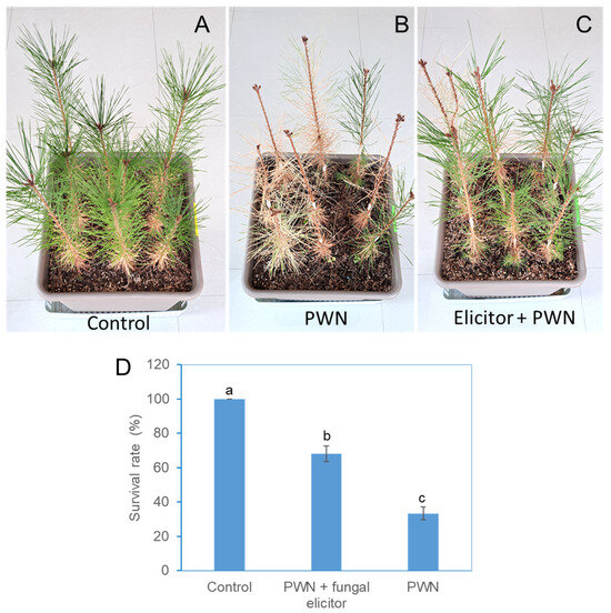 Effects of soil drenching with P. chrysogenum elicitor on P. densiflor seedlings: (A) Control plants without fungal elicitor treatment. (B) Seedlings infested with B. xylophilus without fungal elicitor pretreatment. (C) Seedlings infested with B. xylophilus after pretreatment with fungal elicitor for two weeks. (D) Seedling survival after five months. Pictures and data were collected five months after B. xylophilus infestation. Data are presented as means ± standard errors from three replicates. Different letters indicate statistically significant differences (p < 0.05) as determined by Duncan’s multiple range test.