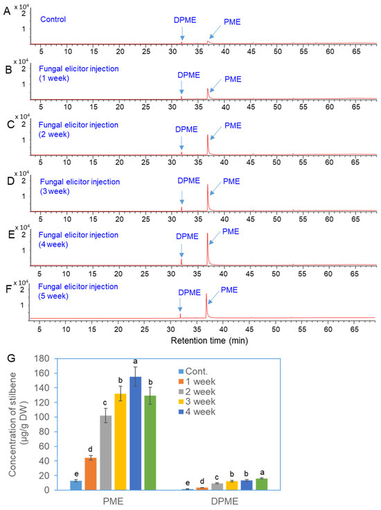 GC/MS analysis of DPME and PME production in needles of P. densiflora after trunk injection of fungal elicitors from P. chrysogenum. (A) Chromatogram of needle extracts from plants without trunk injection of fungal elicitors. (B–F) Chromatograms of needle extracts after 1 week (B), 2 weeks (C), 3 weeks (D), 4 weeks (E), and 5 week (F) following trunk injection of the fungal elicitor. (G) Contents of DPME and PME in needles. Data are presented as means ± standard errors from three replicates. Different letters above the bars indicate a statistically significant difference (p < 0.05), as determined by one-way ANOVA followed by Duncan’s multiple range test.