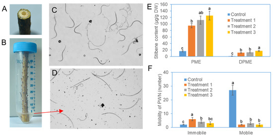 Effects of fungal elicitor trunk injection on B. xylophilus mobility in nodal segments of P. densiflora branches. (A) Photographs showing B. xylophilus infection at the hole of the distal portion of excised branch segments. (B) Branch segment infected with B. xylophilus placed in a 50 mL Falcon tube, with the proximal end immersed in water. The B. xylophilus that escaped from the branch segments were observed under a light microscope. (C) Photograph of B. xylophilus escaping from a branch segment of a control plant (without elicitor injection). (D) Photograph of B. xylophilus escaping from a branch segment of a plant treated with fungal elicitor trunk injection (E) Levels of DPME and PME in the needles of control plants and three independent pine plants after fungal elicitor injection. (F) Number and motility of B. xylophilus escaping from branch segments of control and fungal elicitor-treated plants. Different letters above the bars indicate statistically significant differences (p < 0.05) as determined by one-way ANOVA followed by Duncan’s multiple range test.