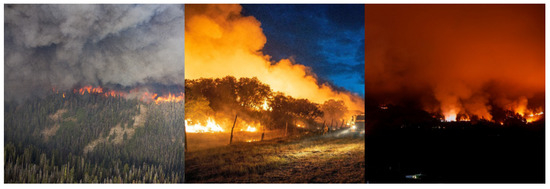- Goss, M.; Swain, D.L.; Abatzoglou, J.T.; Sarhadi, A.; Kolden, C.A.; Williams, A.P.; Diffenbaugh, N.S. Climate change is increasing the likelihood of extreme autumn wildfire conditions across California. Environ. Res. Lett. 2020, 15, 094016. [Google Scholar] [CrossRef]
