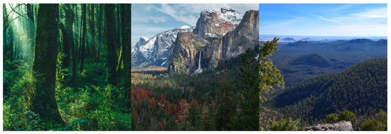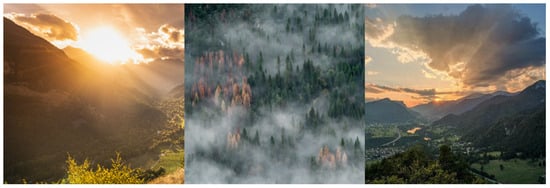 The dataset presented in this paper was obtained through the collection and collation of data from several sources, including the Google search engine, the Kaggle platform, the Mendeley Data repository and the Northern Arizona University repository. This dataset consists of three parts. The first part is the wildfire images, which include forest fires occurring in various environments and at different times, as illustrated in Figure 1. This part can provide the model with wildfire features in a variety of colours, shapes, and dynamic textures, thereby enabling the model to identify wildfires in different geographic areas, seasons, and weather conditions. The second part is conventional forest images, encompassing a range of forest scenes devoid of wildfire, as illustrated in Figure 2. This part provides background data that facilitates the model’s ability to discern between fire and non-fire scenarios. The third part is images of disturbances, including sunsets and sunrises, fog, and other phenomena that may be perceived as disruptive, as illustrated in Figure 3. This part is intended to improve the robustness of the model. Scenes such as the sun, white clouds, and mist have some similar features to wildfire scenes. These similarities can lead the model to identify the absence of fire as the presence of fire. The incorporation of these images into the dataset can effectively reduce the false alarm rate.