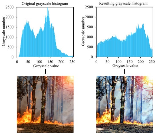 The images in the dataset are subjected to adaptive histogram equalisation, followed by bilateral filtering and flipping. The resulting graph is presented in Figure 5. Ultimately, the dataset constructed in this paper comprises 20,000 images, with a ratio of 4:1 between the training set and the test set. Furthermore, the ratio of fire and non-fire images is 1:1 in both the training and test sets, thereby ensuring a balanced distribution of samples.