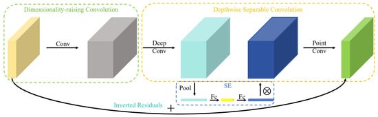The second part is the bottleneck module, which constitutes the core module of MobileNetV3-Small. The structural configuration is illustrated in Figure 7. The Bottleneck module is constituted by dimensionality expansion convolution, DSC, SE module, and inverted residual structure. The dimensionality expansion convolution increases the dimensionality of the input feature matrix through the application of a 1 × 1 convolution layer. The remaining components will be described in detail.
