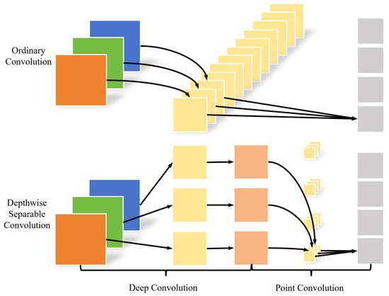 DSC is a structure proposed by the Google team in the MobilenetV1 model [28], which greatly reduces the number of parameters compared to ordinary convolution. Assuming that the number of input channels is 3 and the number of output channels is 4, a comparison between the two is presented in Figure 8.