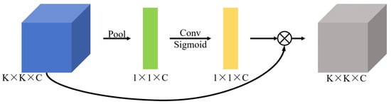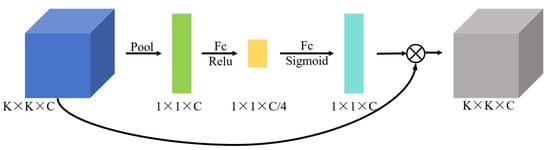 SE is a commonly used channel attention mechanism in the context of deep learning [29], which can significantly improve the model’s performance. The structure of SE is depicted in Figure 9. Initially, the K × K × C feature matrix is subjected to a global average pooling operation, resulting in the generation of a 1 × 1 × C feature matrix. Subsequently, the channel weight values are obtained through a first fully connected layer and a ReLU activation function, resulting in a dimensionality reduction of the channels. Afterwards, the feature matrix is expanded in dimensionality to the initial number of channels through a second fully connected layer, with the weights being mapped in the range of [0,1] through the utilisation of the sigmoid activation function. Ultimately, the learned weights are multiplied with the corresponding channels of the input feature matrix, which serves to enhance the important channels while suppressing those that are unimportant.
