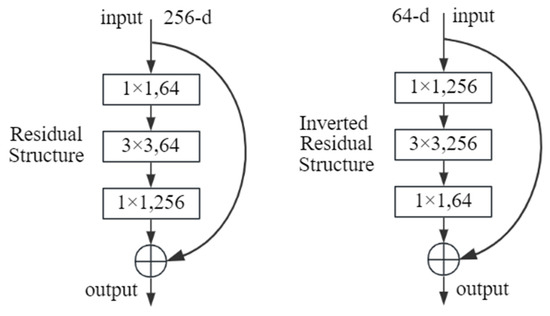 The inverted residual structure is a concept put forth by the Google team in the MobilenetV2 model [30], drawing inspiration from the residual structure. The residual and inverted residual structures are illustrated in Figure 10. The function of the residual structure is to perform dimensionality reduction of the feature matrix in order to reduce the computational burden, followed by dimensionality expansion to restore the initial dimensionality and add it to the input features, thus improving the feature expression. In contrast, the inverse residual structure exploits the benefits of DSC. It begins with dimensionality expansion, enabling the learning of additional features with minimal computational cost. Subsequently, it undergoes dimensionality reduction to the initial dimension and splicing with the input channels, as opposed to the direct addition observed in the residual structure.