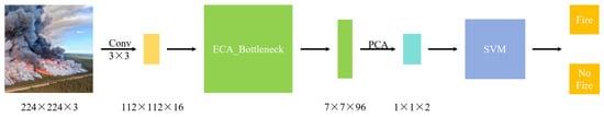 In this paper, the ECA is employed to supplant the SE module in MobileNetV3-Small, and the PCA_SVM to replace the classification layer of the model. Ultimately, an EPS-based MobileNetV3-Small wildfire identification model is constructed, and its structural sketch is illustrated in Figure 12.