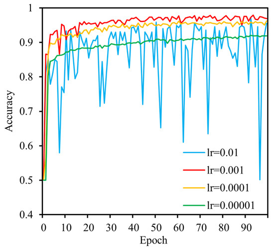 In this experiment, all models employ the batch training method, with a batch size of 64. The loss function utilises the cross-entropy loss function, and the optimiser is AdamW. Before the commencement of the experiment, it was necessary to select an appropriate initial learning rate for AdamW. The learning rate influences both the speed of parameter update and the final result. If it is set too low, the model may fall into a local optimum. Conversely, if it is set too high, convergence may be impeded. In order to identify the optimal learning rate for the model, a grid search was conducted using learning rates of 0.01, 0.001, 0.0001, and 0.00001. The resulting accuracy curve is presented in Figure 13. When the learning rate is set to 0.01, the curve exhibits pronounced oscillations. At a learning rate of 0.001, the curve displays enhanced smoothness, accompanied by the highest accuracy. Conversely, when the learning rate is set to 0.0001 or 0.00001, the accuracy declines progressively. The final training results for all learning rates are presented in Table 3. The highest accuracy was observed when the learning rate was 0.001, and thus this value was selected as the initial learning rate for the experiment.