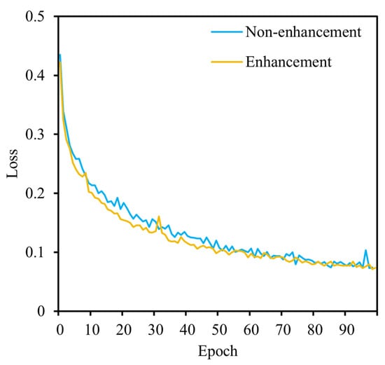 The dataset in this paper has been expanded through the utilisation of an image enhancement technique, which has resulted in an improvement in the model’s performance to a certain extent. In order to validate the viability of image enhancement, the dataset was subjected to a comparative analysis, employing the loss value as the metric. The results are illustrated in Figure 14. The loss value subsequent to image enhancement exhibits a more rapid decline than that observed prior to enhancement. The ultimate training outcomes for both instances are presented in Table 4. Before image enhancement, the accuracy rate was 98.45%, with a precision rate of 98.60%. Following image enhancement, the accuracy rate was 98.48%, with a precision rate of 99.29%. This represents an improvement of 0.03% and 0.7% in the accuracy and precision rates, respectively.
