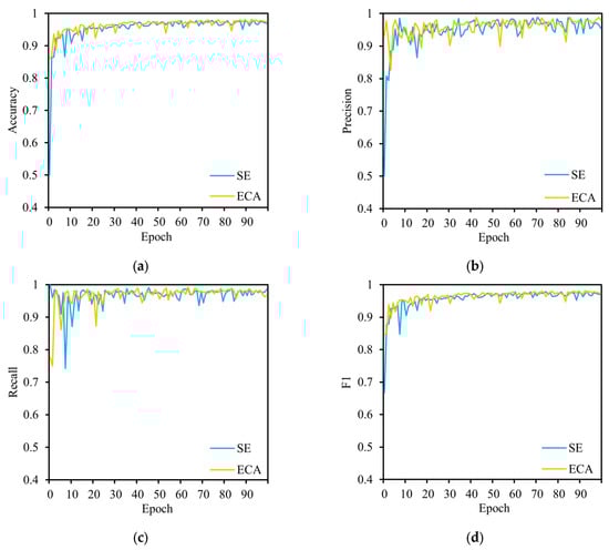 In this paper, the ECA is employed as a replacement for the SE module in the original model. Two sets of experiments were conducted to validate this approach, one utilising the SE module and the other employing the ECA module. The individual performance curves for both are illustrated in Figure 15. The comparison waveforms of accuracy, precision, recall, and F1 score are presented, demonstrating that the ECA performs slightly better than the SE in terms of accuracy, precision, and F1 score, while recall is slightly worse than SE. The specific results are shown in Table 5. Following the replacement of the SE module with the ECA, an increase of 0.16% in accuracy, a decrease of 0.15% in precision, an increase of 0.45% in recall, an increase of 0.0016 in F1 score, and an increase of 5.07 in the average frame rate were observed. In light of these findings, it can be concluded that the MobileNetV3-Small model based on the ECA is a more suitable option for real-time fire monitoring.