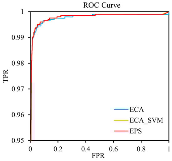 Once the SVM parameters have been determined, this paper proposes adding a PCA method to the dimensionality reduction of the feature matrix prior to SVM, aiming to further improve the recognition efficiency of SVM. The following is a comparison of the above models based on ECA, ECA_SVM, and EPS, and the resulting ROC curves are presented in Figure 16. It can be observed that the ROC curves based on EPS and those based on ECA_SVM are essentially similar, with both being closer to the upper-left corner than the curves based on ECA. The specific results are provided in Table 7. The EPS-based model exhibits the highest accuracy, average frame rate, and F1 score among the three improved models. The ECA-based model demonstrates the highest precision rate, while the ECA_SVM-based model exhibits the highest recall rate. Taking the average frame rate as the first index and considering the rest of the indexes, the EPS-based MobileNetV3-Small model was selected as the final wildfire identification model in this paper.